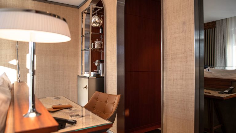 All located on the first floor, these rooms enjoy the privilege of having a terrace lined with stone colonnades and original stone statues. The interior decoration expresses Philippe Starck’s creative aesthetic choices: transparency of the fluted glass partitions between the spaces, mahogany-colored wood and shiny metal, thick wool carpets and finesse of the white net curtains, rigorous straight lines and generous curves.